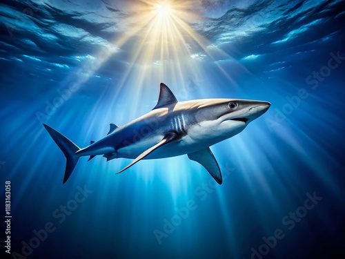 Fototapeta premium Majestic Ocean Shark: Drone Aerial View of a Lone Shark Swimming in Crystal...