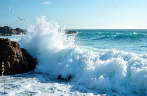 © Sergey, Fototapeta premium Majestic ocean waves crashing on rocky coastline under clear blue sky