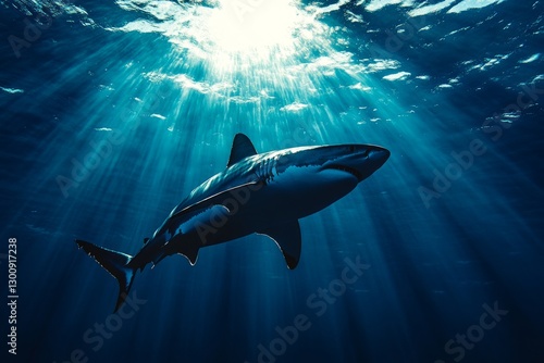 Fototapeta premium Majestic oceanic whitetip shark gracefully navigating the deep blue, illuminated by sunbeams piercing the surface