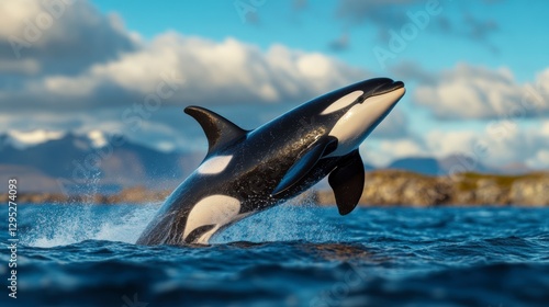 Fototapeta premium Majestic orca breaches the ocean surface under a dramatic sky with distant mountains in view