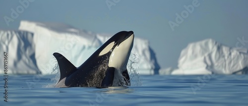 © Starkreal, Fototapeta premium Majestic Orca Breaching Near Iceberg in Arctic Landscape with Clear Blue Sky -