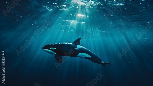 Fototapeta premium Majestic Orca Gliding Through Luminous Blue Ocean Depths