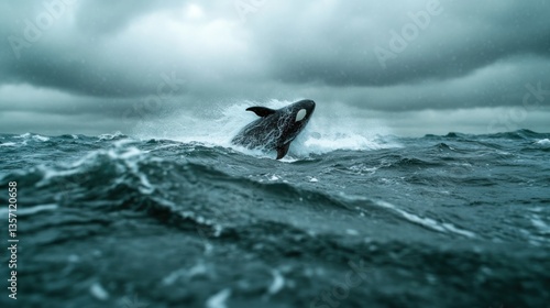 Fototapeta premium Majestic Orca Whale Breaching Under Stormy Gray Sky Over Ocean Waves