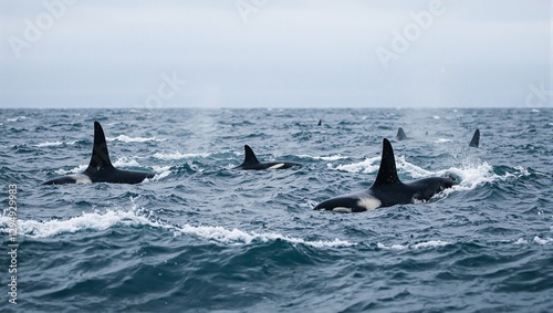 Fototapeta premium Majestic orcas swimming in the Pacific Ocean their sleek black and white bodies contrasting with the cloudy sky and misty atmosphere