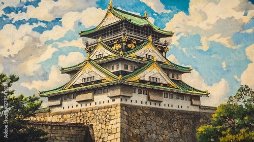 © Tcukimay, Fototapeta premium Majestic Osaka Castle, Japan, under a dramatic sky.