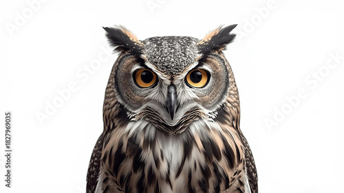 © Arslan, Fototapeta premium Majestic owl close-up with intense yellow eyes on white background. Detailed feathers and captivating stare of this wise nocturnal bird of prey. Wildlife nature predator.