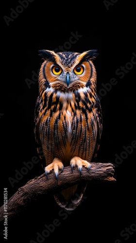 © trustmastertx, Naklejka premium Majestic owl perched on a branch against a black background.