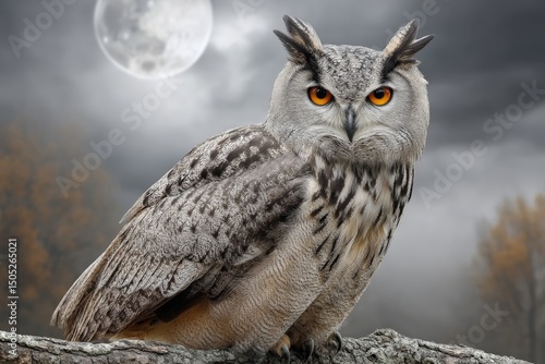 Obraz premium Majestic owl perched on a branch under the moonlight in a misty forest...