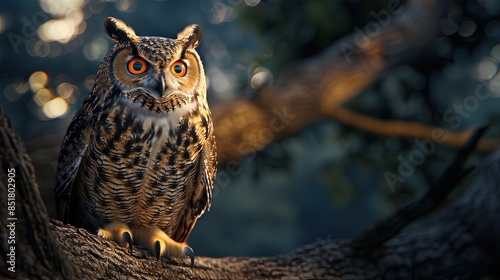 © AIsofeel, Obraz premium Majestic owl perched on a tree branch with a blurred forest background, illuminated by natural light, showcasing its striking features.