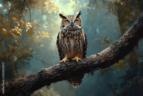 © olegganko, Obraz premium Majestic owl perched on an ancient tree in a misty landscape at dawn