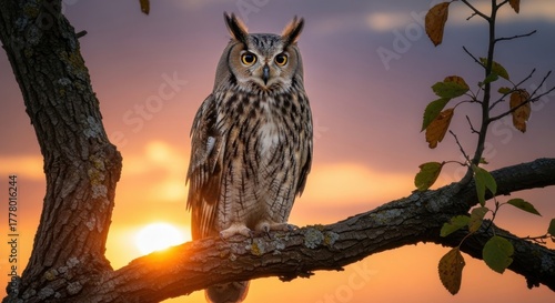 © HapeTany, Obraz premium Majestic Owl Perched on Branch Against Vivid Sunset Sky, Intense Gaze.