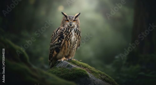 © arif, Obraz premium Majestic owl perched on mossy rock in a hazy, green forest