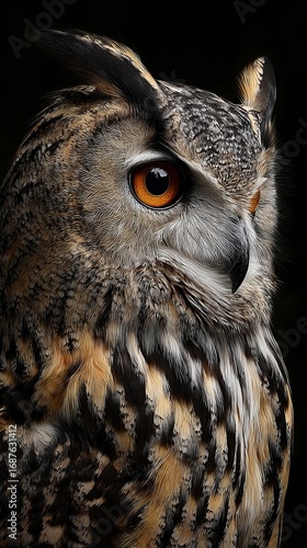 © Suradet Rakha, Fototapeta premium Majestic Owl Portrait with Striking Eyes Against Dark Background