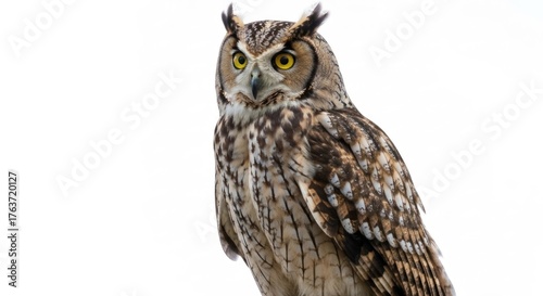 © arif, Fototapeta premium Majestic owl stares intensely with bright yellow eyes, against white background