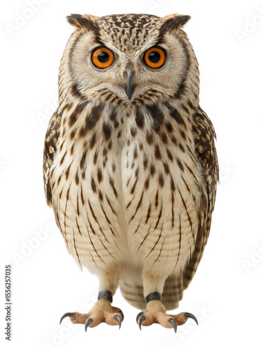 © Red X and Co, Naklejka premium Majestic Owl with Striking Orange Eyes and Intricate Feather Patterns, Perfectly Positioned for a Stunning Portrait, Isolated on Transparent and White Background