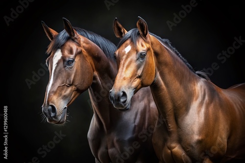 Obraz premium Majestic Pair: Two Elegant Horses on Black Background - High-Resolution Stock...