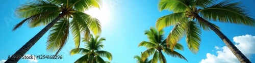Fototapeta premium Majestic palms reach for azure sky, sunlit leaves, tall, landscape, columnar