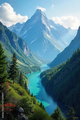 © Napat, Obraz premium Majestic Panoramic Wilderness Towering Mountains, Dense Forests, Pristine River