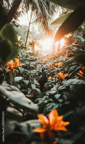 © alisya, Fototapeta premium Majestic peacock amidst lush foliage and vibrant orange flowers at sunset.