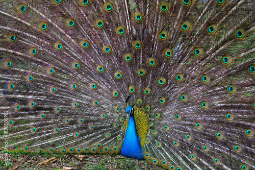 © TannySolt, Obraz premium Majestic Peacock Displaying His Iridescent Tail Feathers with Brilliant Ocelli