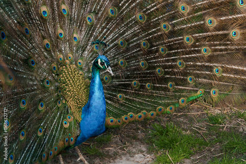 Obraz premium Majestic Peacock Displaying Its Vibrant Plumage in Nature