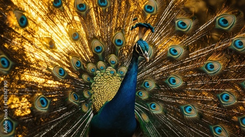 © Ikhsan, Obraz premium Majestic peacock displaying vibrant plumage against a golden sunlit backdrop.