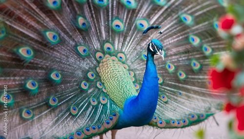 © ARSHDEEP, Obraz premium Majestic peacock displaying vibrant plumage in a lush garden setting.