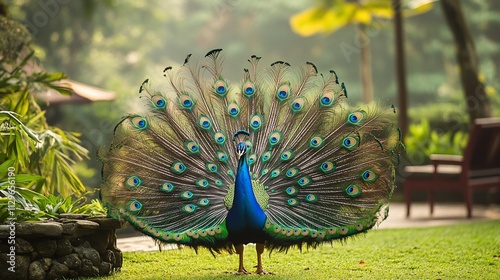 Obraz premium Majestic peacock displaying vibrant plumage in lush garden.
