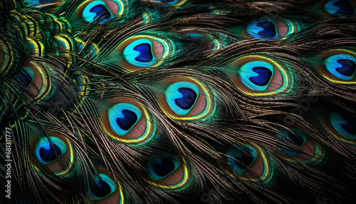 Obraz premium Majestic peacock displays iridescent beauty in vibrant turquoise and blue generated by AI