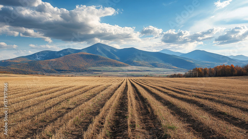 © Almaz, Fototapeta premium Majestic Peaks: A Tranquil Field Amidst High Mountain Ranges
