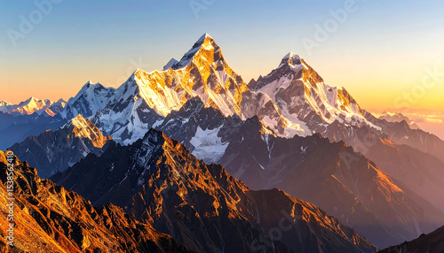 Obraz premium Majestic Peaks Ablaze: Golden Light Dancing on Mountain Majesty,...