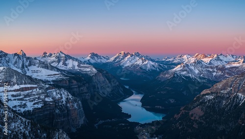 Obraz premium Majestic Peaks and Azure Waters at Sunrise, a Panorama of Natures Grandeur.