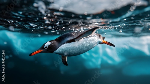 Fototapeta premium Majestic penguin diving gracefully underwater with the frozen Antarctic...