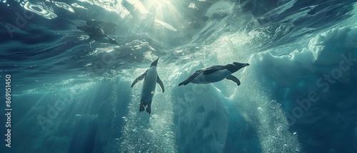© Starkreal, Fototapeta premium Majestic Penguins Diving off Iceberg into Sparkling Ocean under Sunlight in
