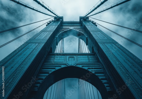 Naklejka premium Majestic Perspective of Suspension Bridge Towers Against Dramatic Clouds in a Blue Tint, Capturing Architectural Beauty and Engineering Marvel