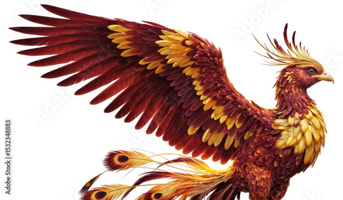 © Flowal93, Fototapeta premium Majestic Phoenix bird with vibrant red and gold fiery feathers in side view