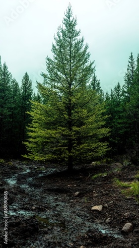 Fototapeta premium Majestic Pine Tree in Forest Mud Path Nature Scene