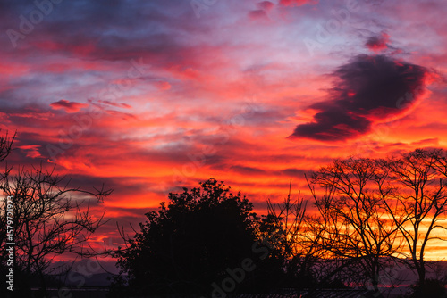 © faithie, Fototapeta premium majestic pink and orange sunrise clouds over suburban australian backyard