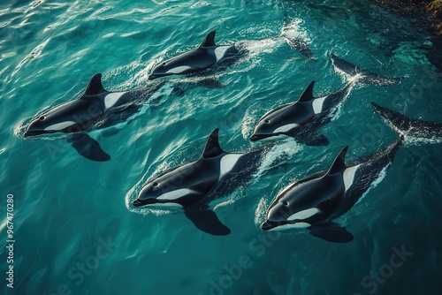 Fototapeta premium majestic pod of orcas gliding through crystalclear azure waters sleek black...