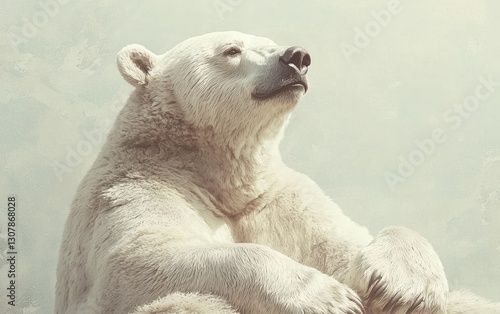 Fototapeta premium Majestic polar bear sitting, gazing upward in serene sunlight.