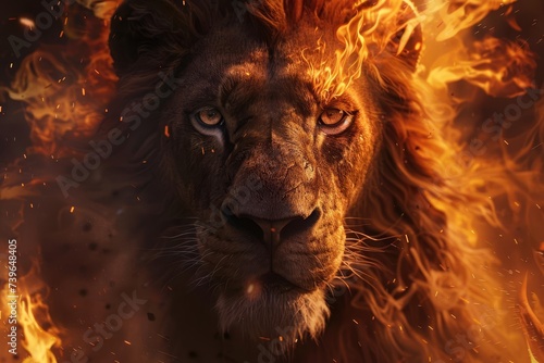 Naklejka premium Majestic portrait of a lion with flames for a mane Embodying strength Power...