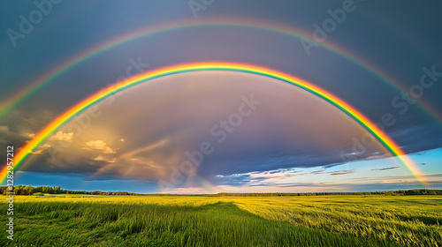 Obraz premium Majestic Quadruple Rainbow Spanning a Serene Landscape with Vibrant Skies and...