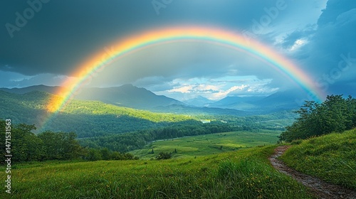 Naklejka premium Majestic rainbow arches over a valley nestled between mountains. Lush green landscape, dramatic clouds