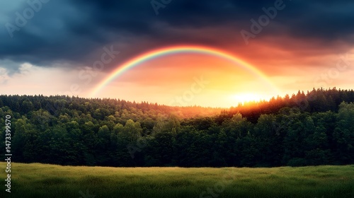 © Thanathon, Naklejka premium Majestic Rainbow Arching Over a Lush Green Forest at Sunset A breathtaking natural landscape photograph
