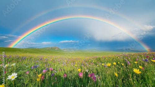 Naklejka premium Majestic Rainbow Arching Over Vibrant Wildflowers in Fresh Rain-Kissed Field