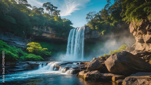 © AbstractAI, Obraz premium Majestic Rainbow Falls Cascading Over Cliffs Surrounded by Lush Greenery and Rock Formations Under a Clear Blue Sky