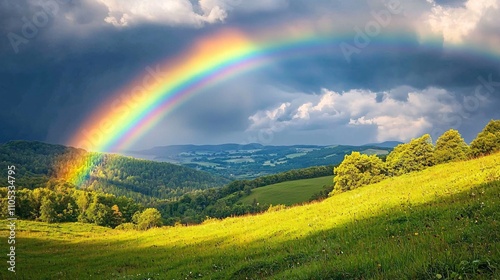 © Darunee, Naklejka premium Majestic Rainbow Over Stormy Valley Captured in Stunning Detail