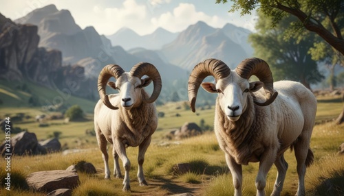 Naklejka premium Majestic ram with large twisted horns in a scenic countryside landscape, majestic, countryside, powerful, horns, horned