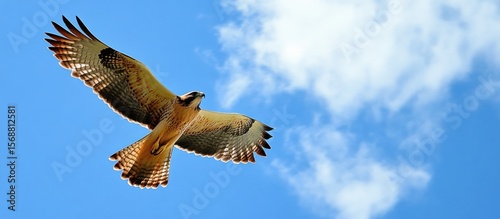 Obraz premium Majestic raptor soars through a serene azure sky dotted with ephemeral clouds