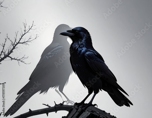 © Kitta Studio, Fototapeta premium Majestic Raven Perched on a Branch Against a Mysterious Background